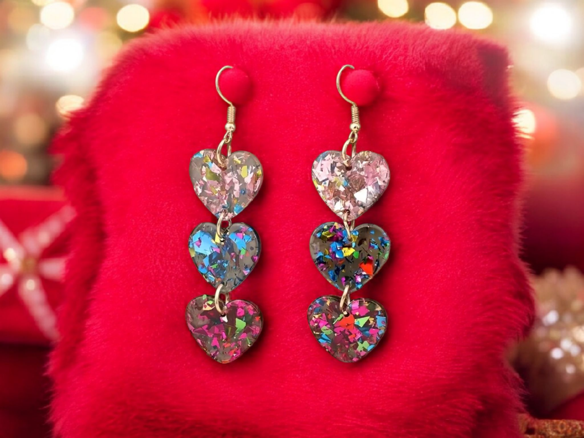 Kauniit Glitter korvikset 3:lla sydämellä.