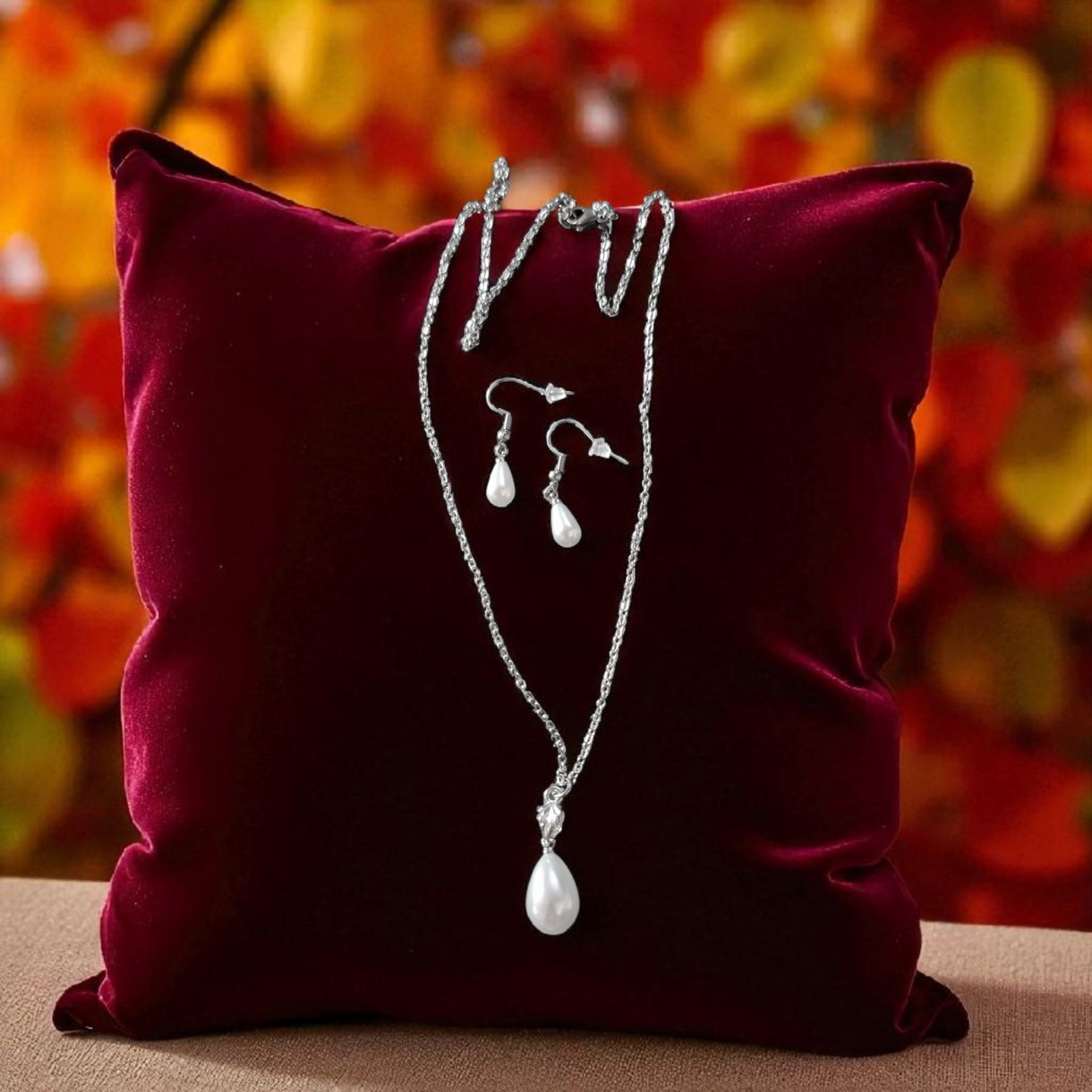 Helmisetti, pisaran muotoiset helmet kaulakorussa ja korviksissa.