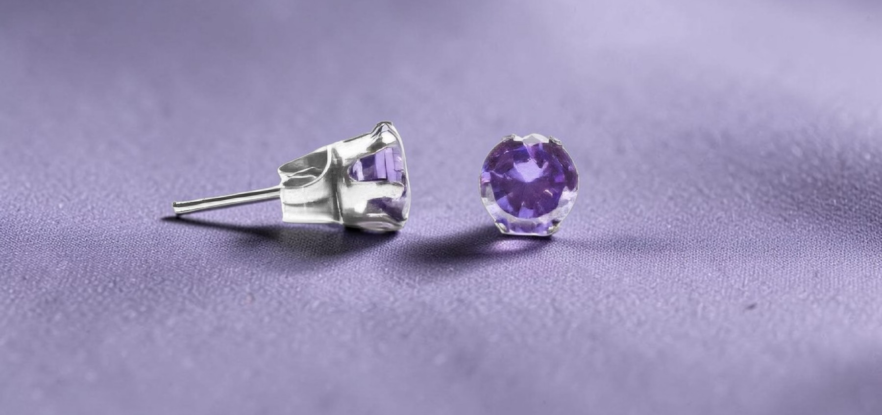 Koruteräksiset nappikorvakorut, joissa on kauniisti säihkyvät, pyöreän muotoiset kivikoristeet. Kivien väri on violetti ja halkaisija 6 mm.