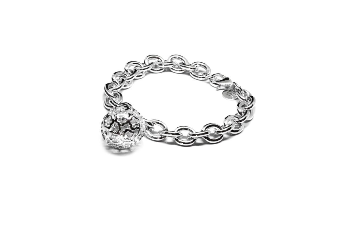 Upea hopeoitu rannekoru kauniilla koristepallolla. Pallon halkaisija on 17 mm ja ketjun pituus19 + 5 cm. Ketjun paksuus on 8 mm.