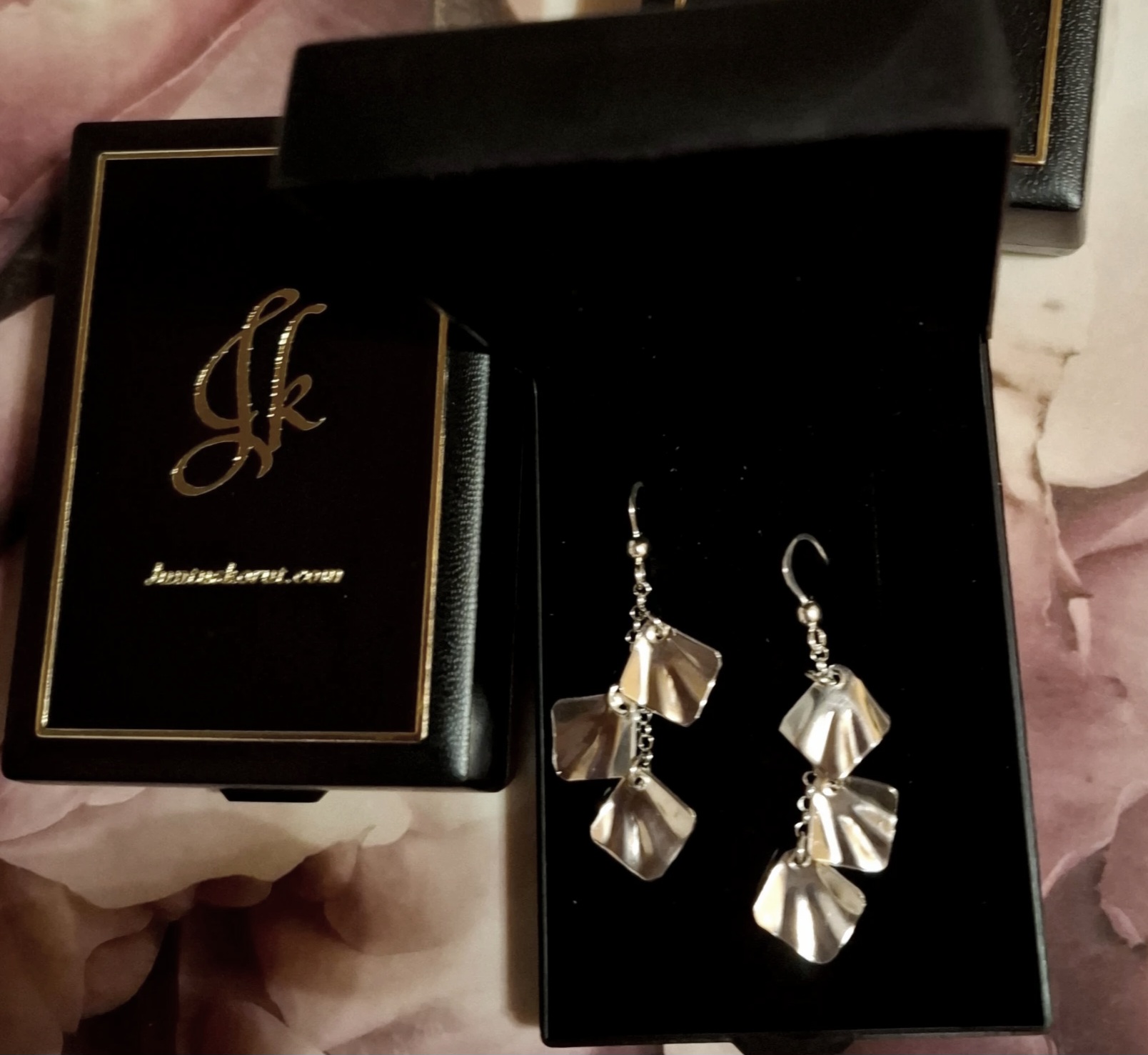 Valmistusmateriaali hopea 925. Saatavana myös kullattuna, tilauksesta.  Riipusosan pituus ilman koukkuja 4 cm. Hopealehtien koko 1x1 cm. Näyttävät käsityönä valmistetut lehdet.