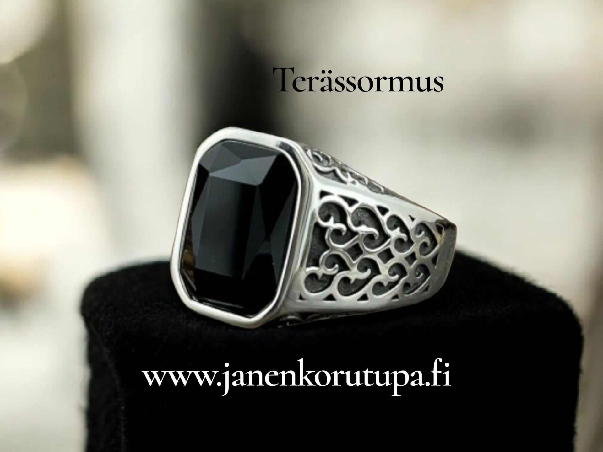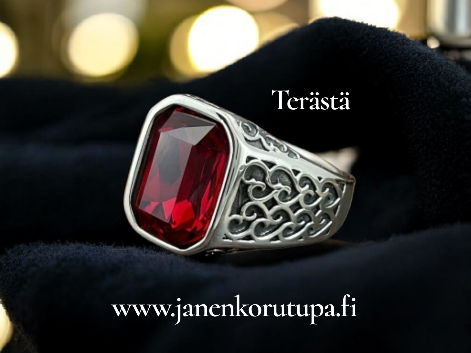 Näyttävä ja upea kantasormus, punaisella tai mustalla kivellä!