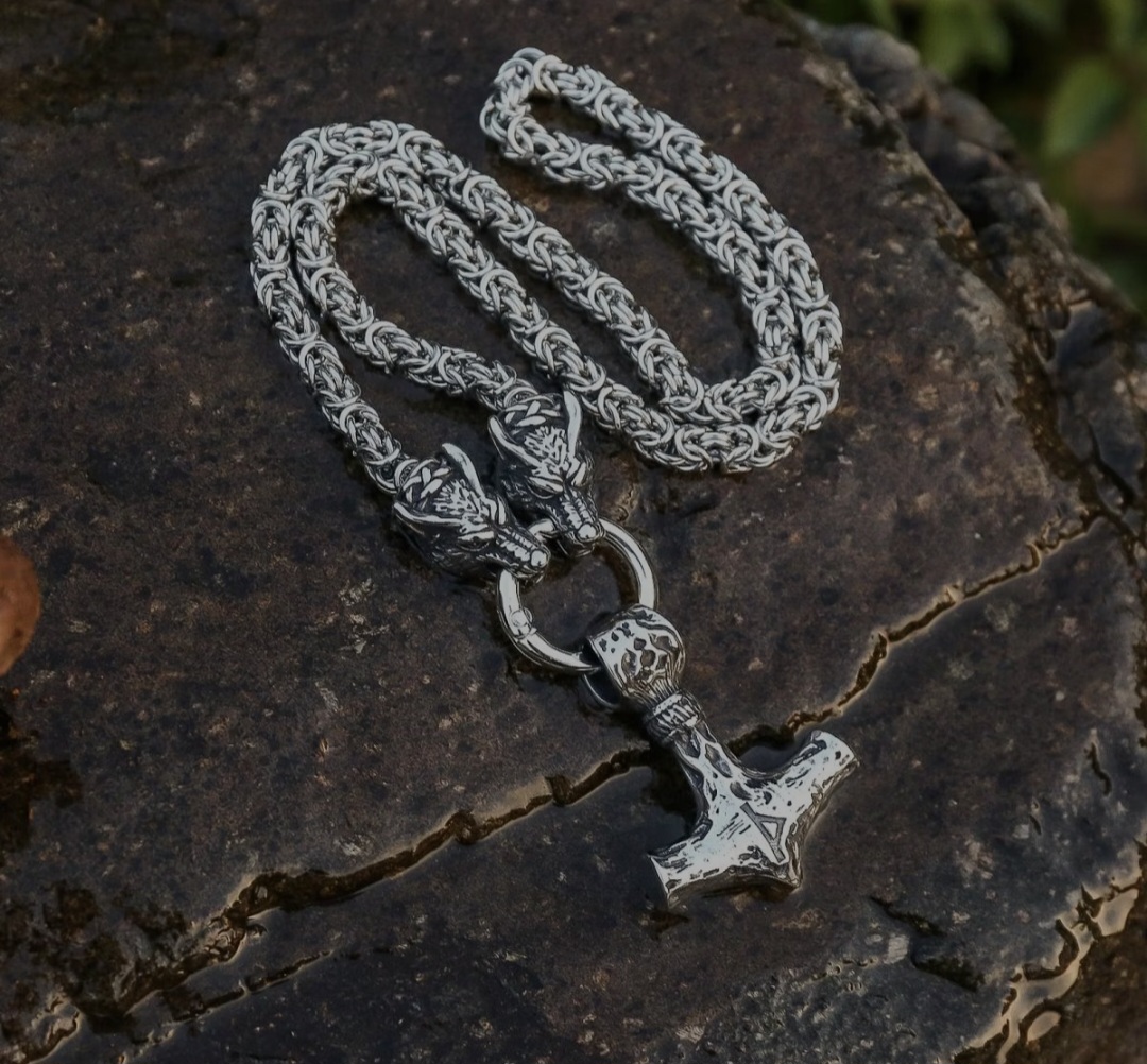 "Odens Vargar" ruostumattomasta teräksestä valmistettu kaulakoru on vaikuttava ja tyylikäs asuste, jossa yhdistyvät sekä vahvuus että eleganssi. Norjalaisesta mytologiasta inspiroitunut kaulakoru edustaa Odinin susien Geren ja Freken voimaa ja uskollisuutta.